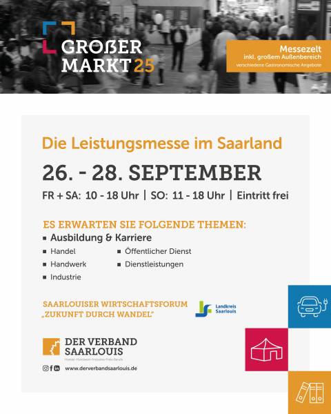 26. bis 28. September 2025 beim Großen Markt 2025 - der Leistungsmesse im SaarlandSave the Date! Vom 26. bis 28. September 2025 wird Saarlouis zum Hotspot der Region – beim „Großen Markt 2025 – der Leistungsmesse im Saarland“! Wir sind natürlich auch mit dabei – Ihr findet uns am Stand FG212 Kommt vorbei, entdeckt unser Angebot und lasst euch inspirieren. Wir freuen uns auf euch! BARTZ FachhändlerHändlerlogin
